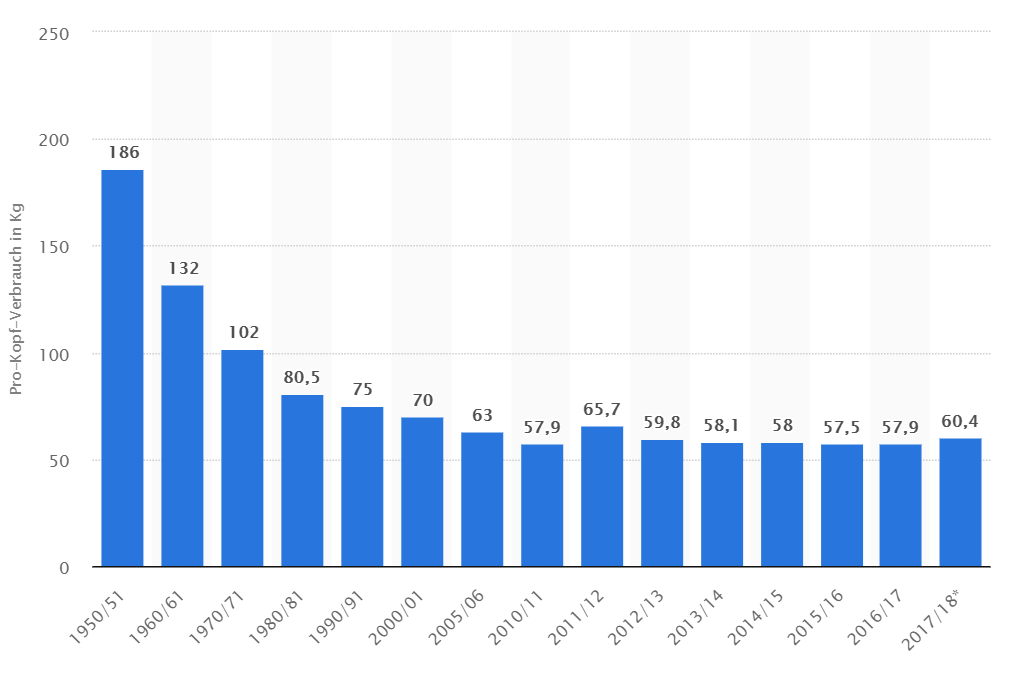 最もこの数値は時代によって大きく変化しています。1950年代から60年代の一人当たりの年間消費量は何と186キログラムという数値が出ています。戦後70年代の間にドイツの人たちの食生活が大きく変化してきたといえるでしょう。