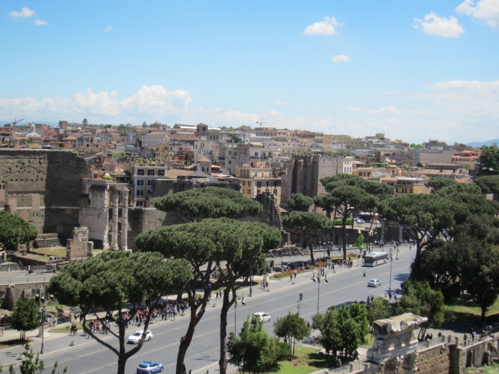 ローマの中心ヴェネツィア広場からコロッセオに向かって一直線に伸びるフォーリ・インペリアーレ通り。両側に、皇帝たちが権威を誇って築いたフォロの跡が並ぶファシズムの時代の名残の広い道路。