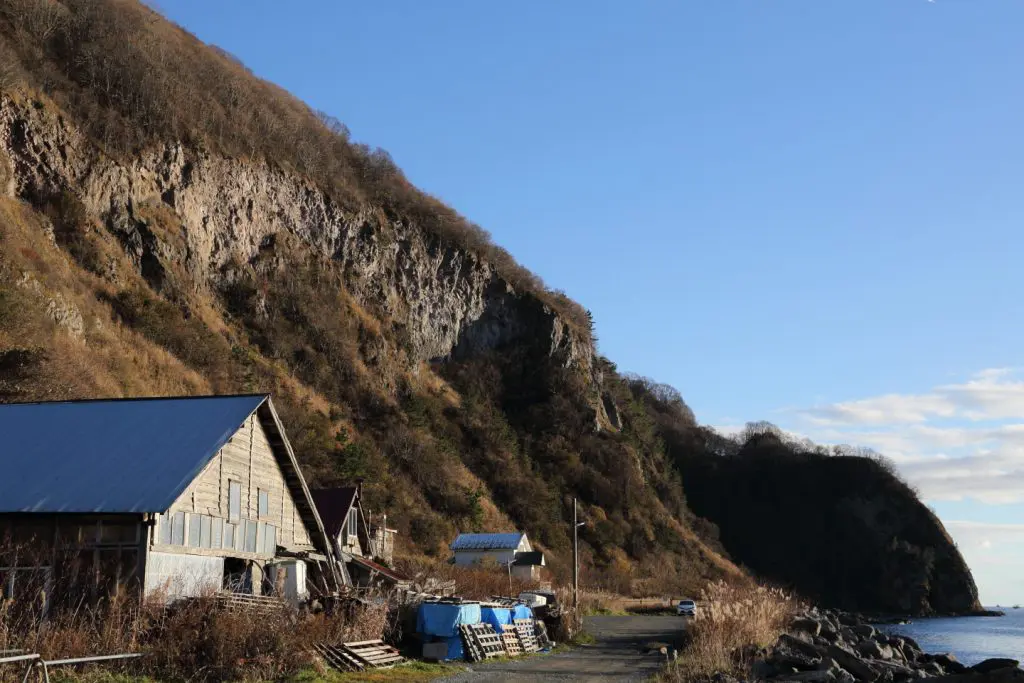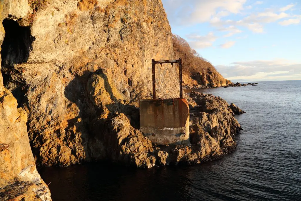 海に半分隠れた洞窟の手前で一般の方は行き止まりになります。しかし、橋を架けた後が残っていて、道のような跡も残っています。これはかつて、断崖絶壁の函館山の裏側に寒川村という「幻の村」が存在しました。明治期に富山県からの入植で函館山の裏側に流れ着き、そのまま定住したとか。電気や水道も通らず、函館の街に出るのも荒波の中絶壁沿いの道を抜け、命がけだったそうです。多い時期には100人ほどの村だったそうですが、昭和29年の洞爺丸台風で壊滅的な被害を受け、村を手放したとか。今はその面影はほとんど残っていません。