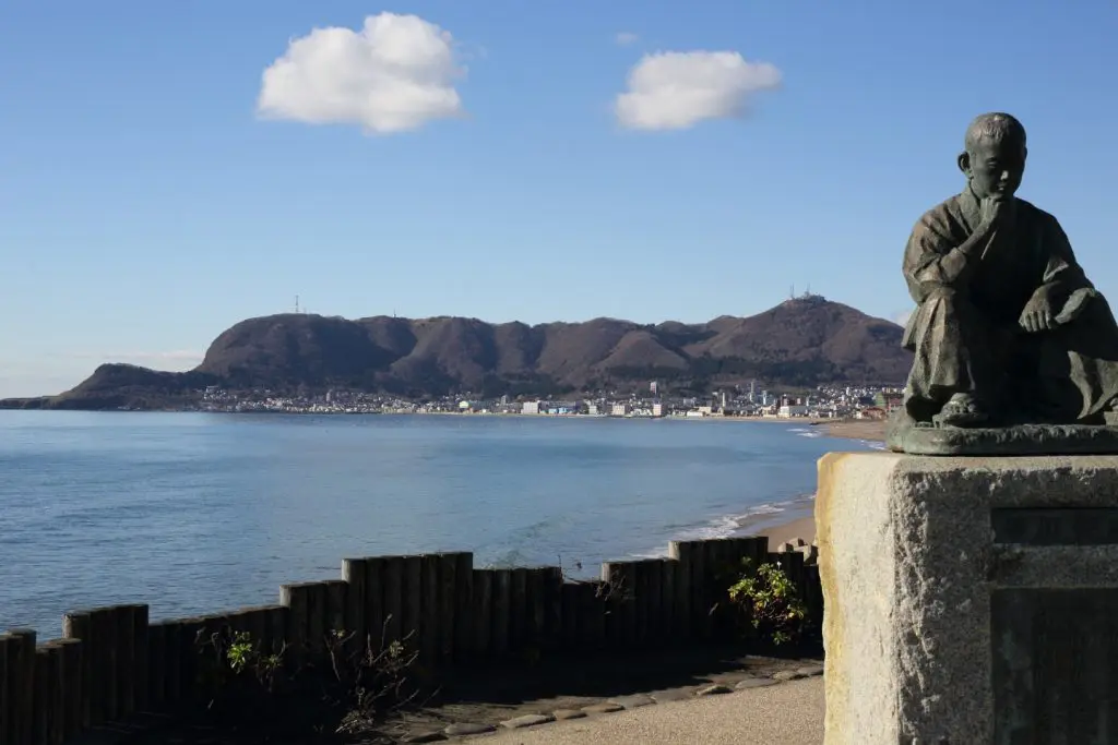晴れていれば遠く青森県の下北半島が望めます。浜沿いには大森海岸を詠んだ「一握の砂」で有名な詩人・石川啄木の彫像がある啄木小公園があり、隣には土方歳三記念館もありますが、ここはぜひとも砂浜に降りて欲しいです。いくつか降りられる場所もあります。観光客の方は中々訪れない海岸ですが、夏場の夜は漁火も綺麗です。また8月下旬には湯の川方面で同海岸から打ち上げる花火大会も行われます。