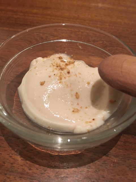 「飲む野菜サラダ」がすべてのランチメニューに付きます。飲みやすい青汁のような一口サイズのジュースです。小鉢が3品と、麦味噌のお味噌汁はおかわり自由。平飼いで育てられた能登産の健康鶏のムネ肉を使い、たくさんの野菜とさっぱりゴマダレと合わせています。トロトロの温泉卵は広島石本農場産。歯ごたえのある玄米ごはんに盛りだくさんの具材が載っていてボリューム満点。デザートにミニ豆乳プリンが付き、ヘルシーながらも食べ応えある内容でした。
