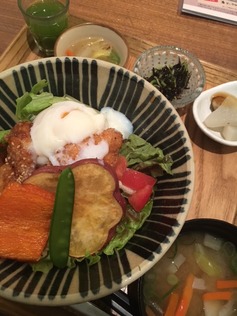 「飲む野菜サラダ」がすべてのランチメニューに付きます。飲みやすい青汁のような一口サイズのジュースです。小鉢が3品と、麦味噌のお味噌汁はおかわり自由。平飼いで育てられた能登産の健康鶏のムネ肉を使い、たくさんの野菜とさっぱりゴマダレと合わせています。トロトロの温泉卵は広島石本農場産。歯ごたえのある玄米ごはんに盛りだくさんの具材が載っていてボリューム満点。デザートにミニ豆乳プリンが付き、ヘルシーながらも食べ応えある内容でした。