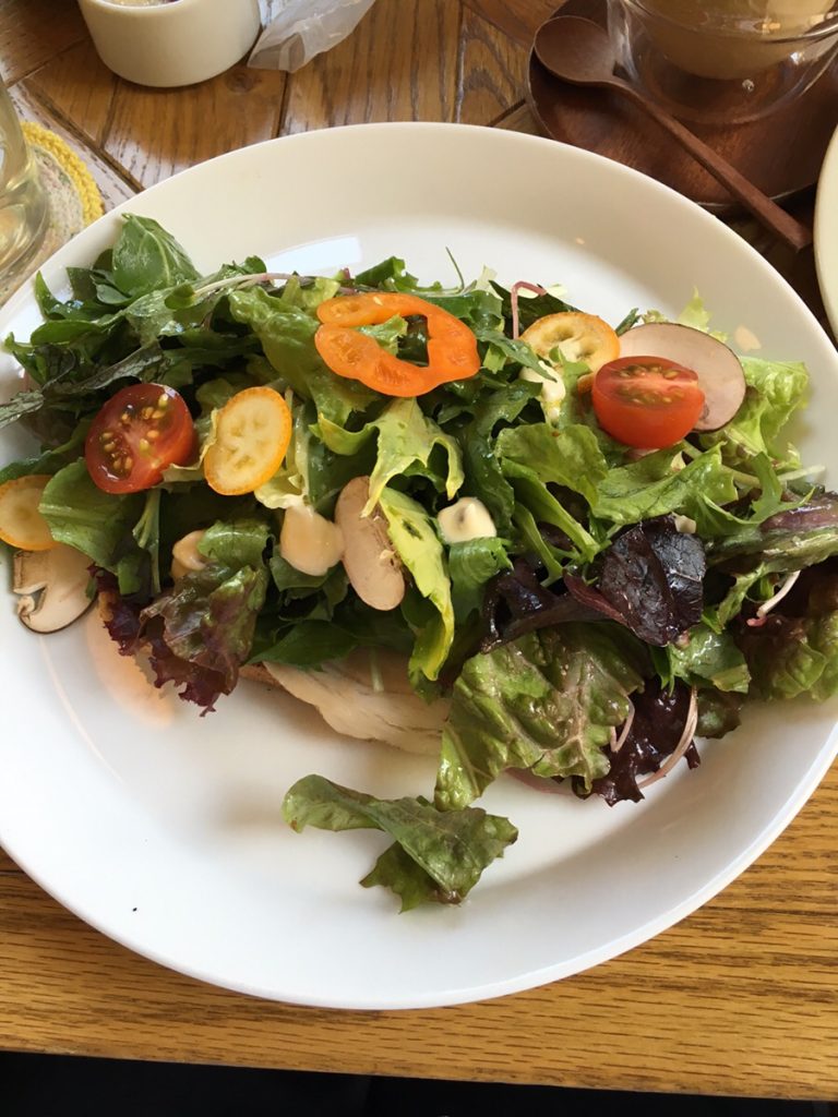 写真ではわかりづらいですが、たくさんの葉野菜の下には、薄くスライスされた黒っぽいライ麦の上に、いわゆる鶏ハムがセットされています。朝から野菜たっぷりで気持ちからヘルシーになれそう。