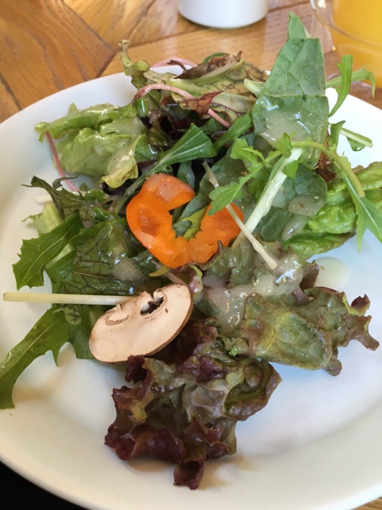 写真ではわかりづらいですが、たくさんの葉野菜の下には、薄くスライスされた黒っぽいライ麦の上に、いわゆる鶏ハムがセットされています。朝から野菜たっぷりで気持ちからヘルシーになれそう。