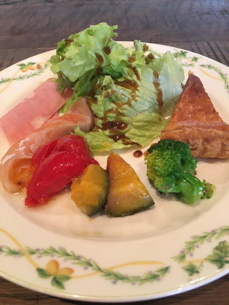 香ばしいキッシュと、アトランティックサーモン、ボロニャソーセージです。そして皮をむいた赤いパプリカのオイルマリネ、ブロッコリー、かぼちゃにレタスとお野菜はたっぷり。サラダ代わりになりますね。どれもとてもシンプルですが、食材選びから手抜きを感じさせない美味しい一口でした。