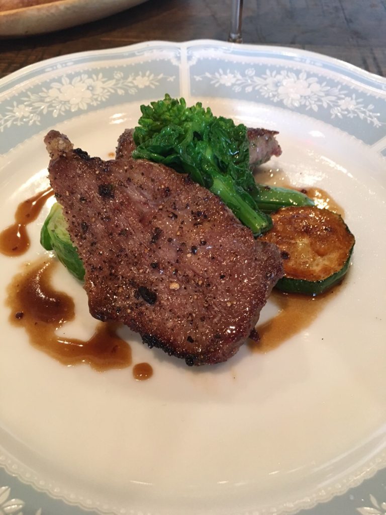 イベリコ豚のローストがやってきました。豚肉2切れと、ズッキーニ、芽キャベツ、色鮮やかな菜の花のソテーが添えられています。