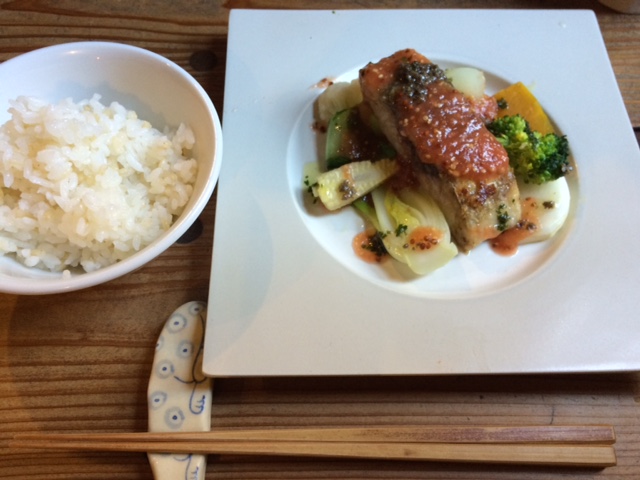 写真下はメインで、魚とお肉から魚をチョイス。この日は、はまちのポワレでした。皮を焼く香ばしい香りが漂います。はまちの身は締まってはいるものの、ジューシーさを感じます。2種類のソース(ベリー系、オリーブ系?)に、たくさんのお野菜が添えられています。雑穀入りごはんがよくすすみます。