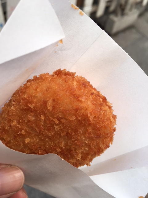 中村屋さんのコロッケは衣がカリッカリで、中のポテトが少し甘いのが特徴。1つ70円とお財布にも優しく、女性でも2つぐらいは軽く胃袋に入ります。甘いのでおやつにもぴったり。食べて行きますと言えば、このように紙に包んでくれます。ミンチカツもおすすめですよ。