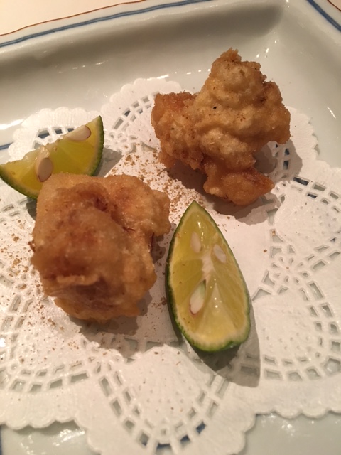 ビジュアルからは「鶏唐」以外の何物でもありませんよね。すだちを絞り、口に運んで驚き、メニューを初めて確認したところ、鱈白子のフリットでした。食べる前にメニューを確認しておけば、一口目から楽しむことができたのに、と反省した一品です。