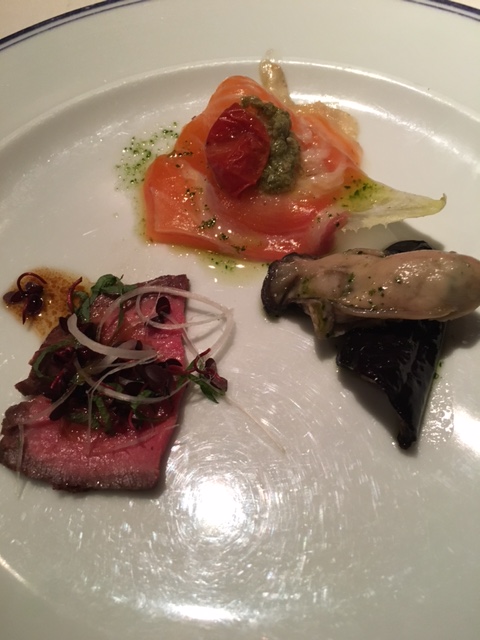 左から時計周りに、黒毛和牛モモ肉のコールドビーフ、タスマニアサーモンのマリネ、仙鳳趾(せんぽうし)産牡蠣のマリネ