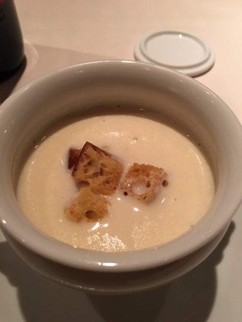 ジャガイモと玉ねぎのポタージュは、クルトンを自分で入れていただきます。小さなサイズですが、素材の風味を生かした味付けで、ホッと一息。