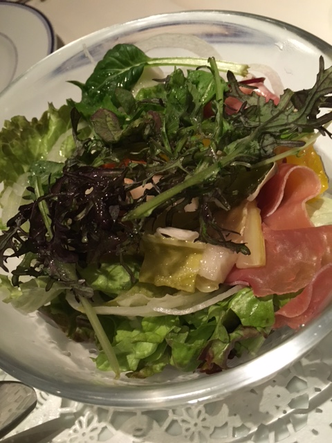 自家製ボンレスハムとピクルスのサラダは、珍しい葉野菜が多く、久しぶりの野菜にハートはホッとしながらいただきます。ボンレスハムは芳醇な生ハムです。
