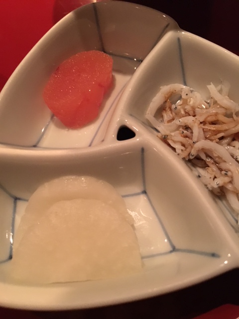 赤盆。お品書きを見ていて気にはなっていたのですが、ごはんとお味噌汁、ごはんのお供のセットが赤いお盆にまとまっています。