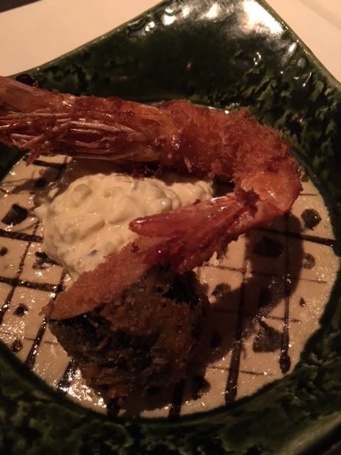 海老フライに茄子のフライを添えて。タルタルソースまろやかで素朴、意外と薄味です。たっぷりつけて、レモンを絞っていただきます。