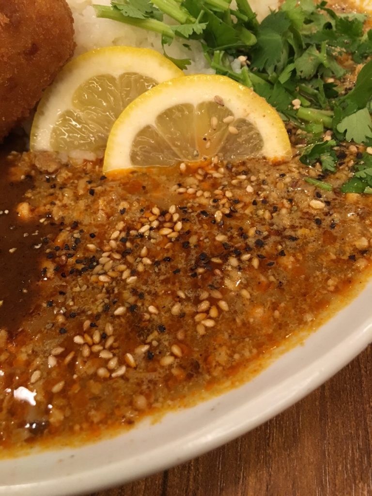 ダルトリトンカレーは、見るからに辛そう。レモンスライスとパクチーがたっぷり乗っています。飛魚や鯖の出汁を使用しており、しっかりと魚介の風味が感じられます。パクチーとの相性もバッチリです。ダル(豆)トリ(鶏)トン(豚)カレーということで、細かい具材もたくさん入っています。スパイスは一部丸ごと入っていてワイルド。スパイスと和風のコンビネーションが美味です。