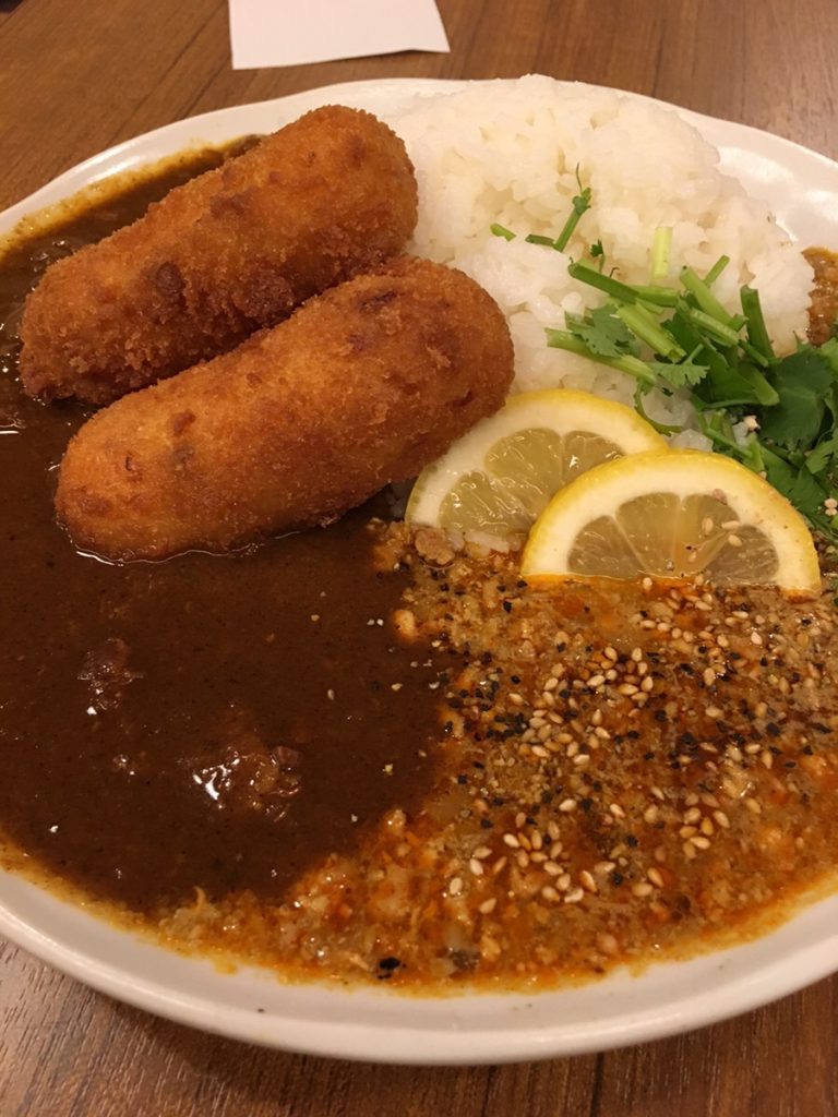 左のスパイス欧風カレーには、煮込まれたお肉がゴロゴロっと。一口目、ほんのりした甘味を期待していましたが、よい意味で裏切られます。スパイス感が前面に来て、後から来る玉ねぎの甘味にホッと。とろみ少なくサラッとしたルーです。クリームコロッケはこちらのカレーとよく合いますね。