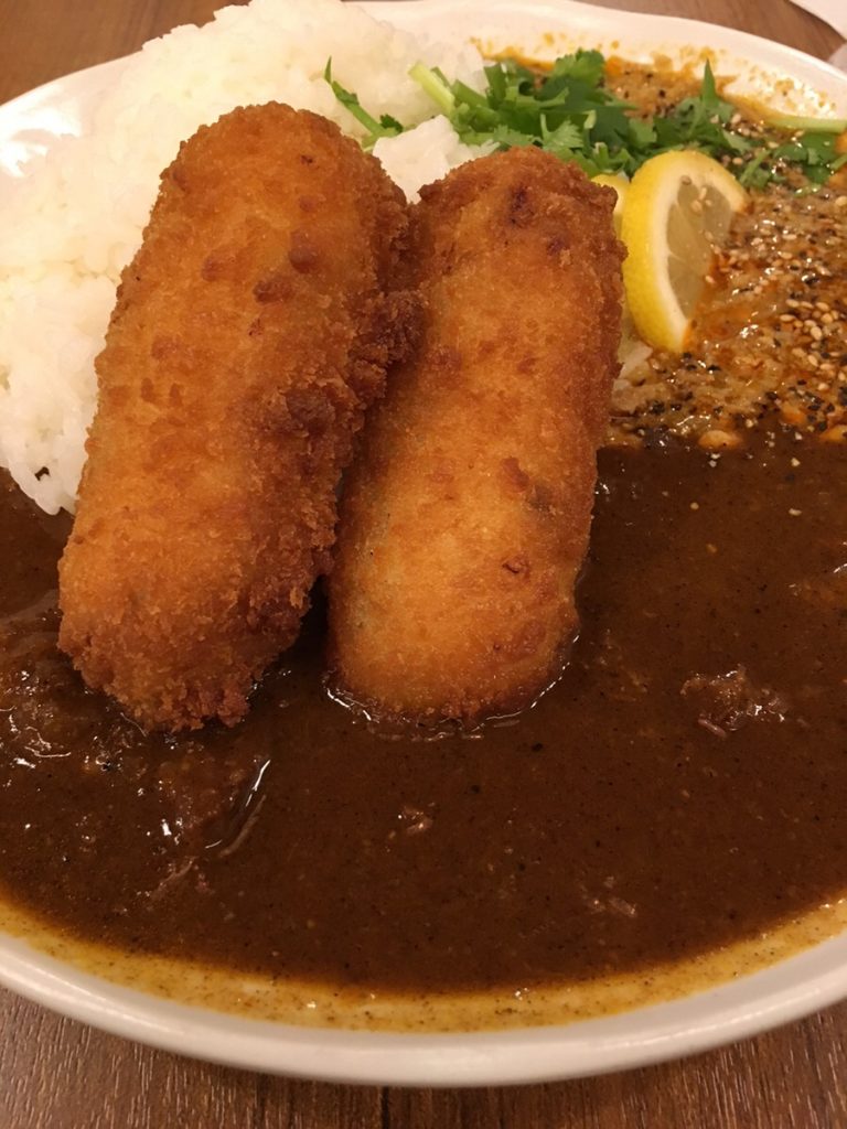 トッピングはお願いしていないのに、何か揚げ物が2本。どうやらランチタイムのサービスのようです。揚げたてでアツアツ、中もふわふわで美味しいクリームコロッケです。